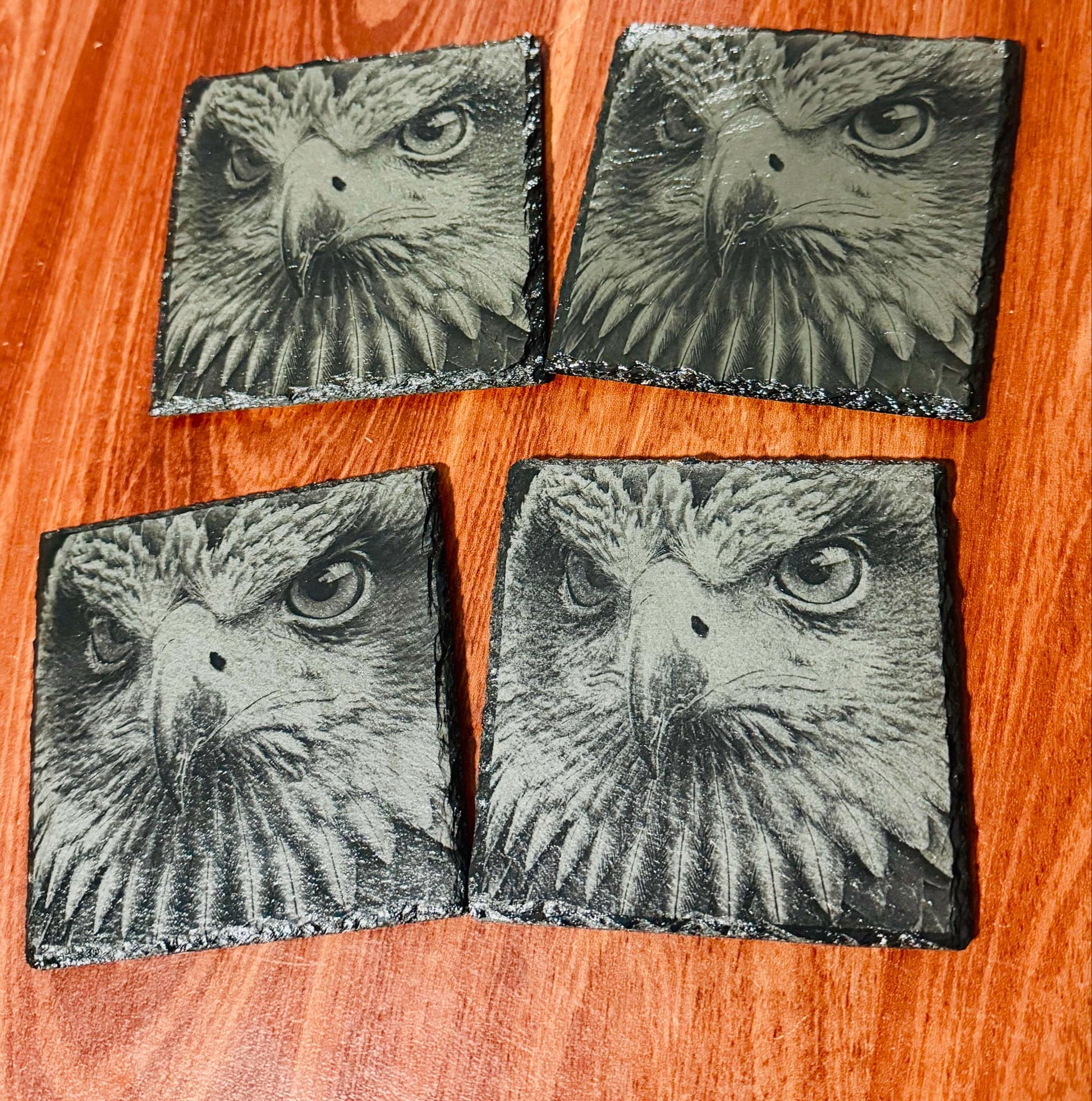 Elevate your drinkware game with these 6 eagle slate coasters. These unique coasters feature a sleek slate material and a majestic eagle design, making them a conversation starter at any gathering. Protect your furniture while adding a touch of quirky style to your home!