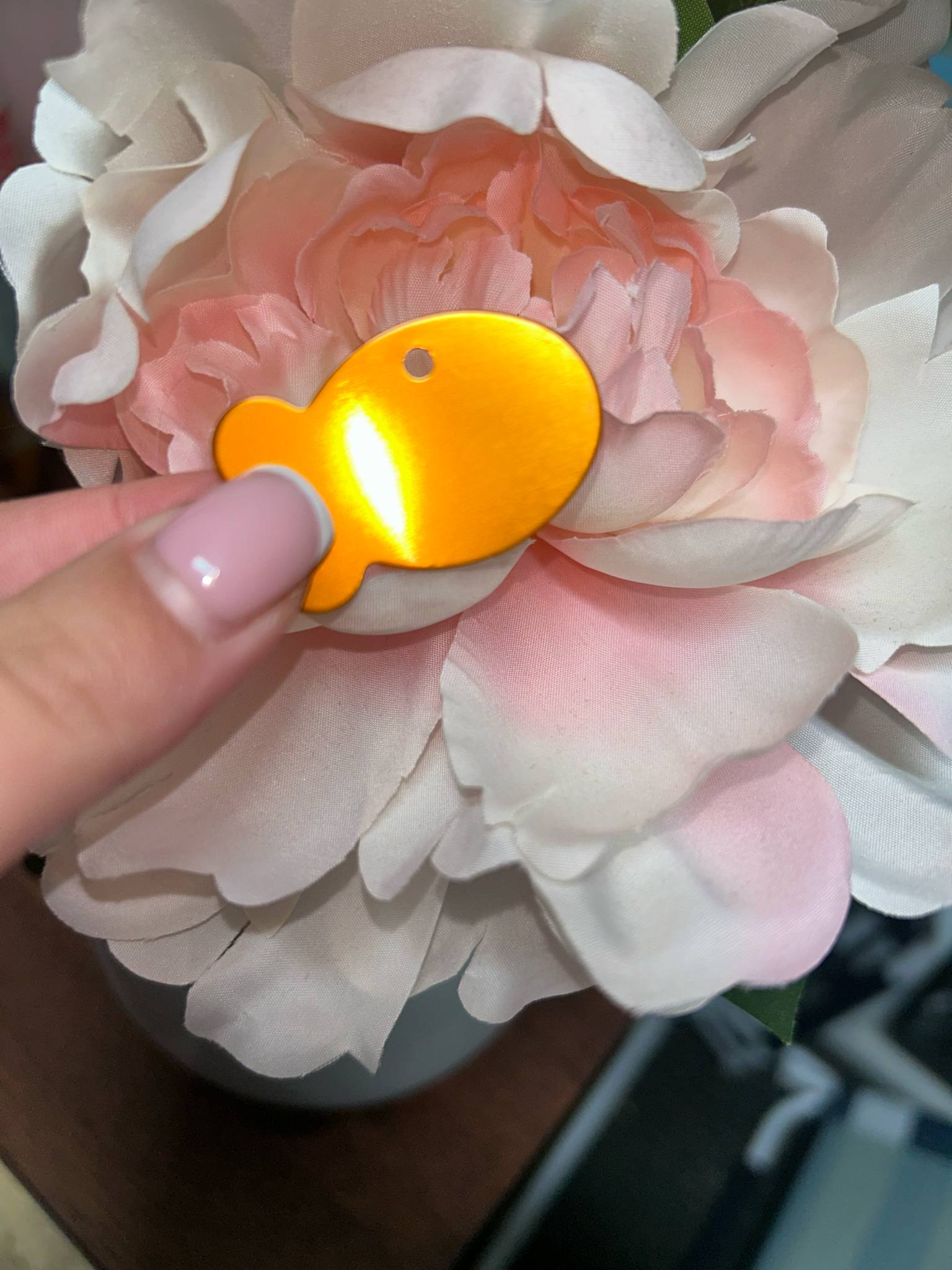 Make a splash with our Gold Fish pet id tag! This shiny tag not only adds a touch of glamour to your furry friend's collar, but also ensures their safe return if they ever get lost. No more fishing around for your pet's id tag, this Gold Fish is sure to stand out!
