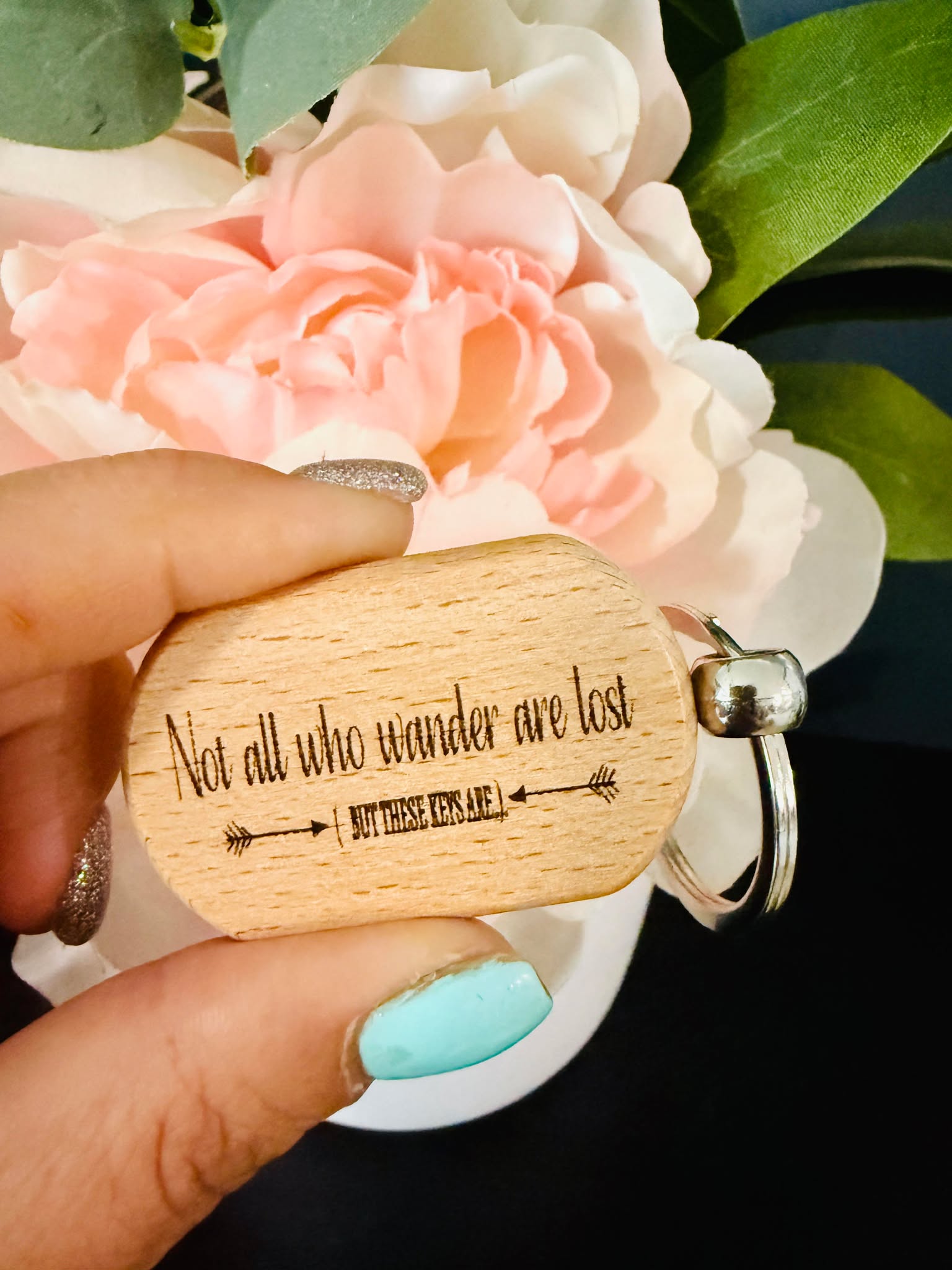 Don't worry about losing your keys with our "Not all who wander" key chain. Perfect for the adventurous soul, it features a playful phrase and space to add your contact details on the back. Stay organized and add a touch of fun to your key ring!