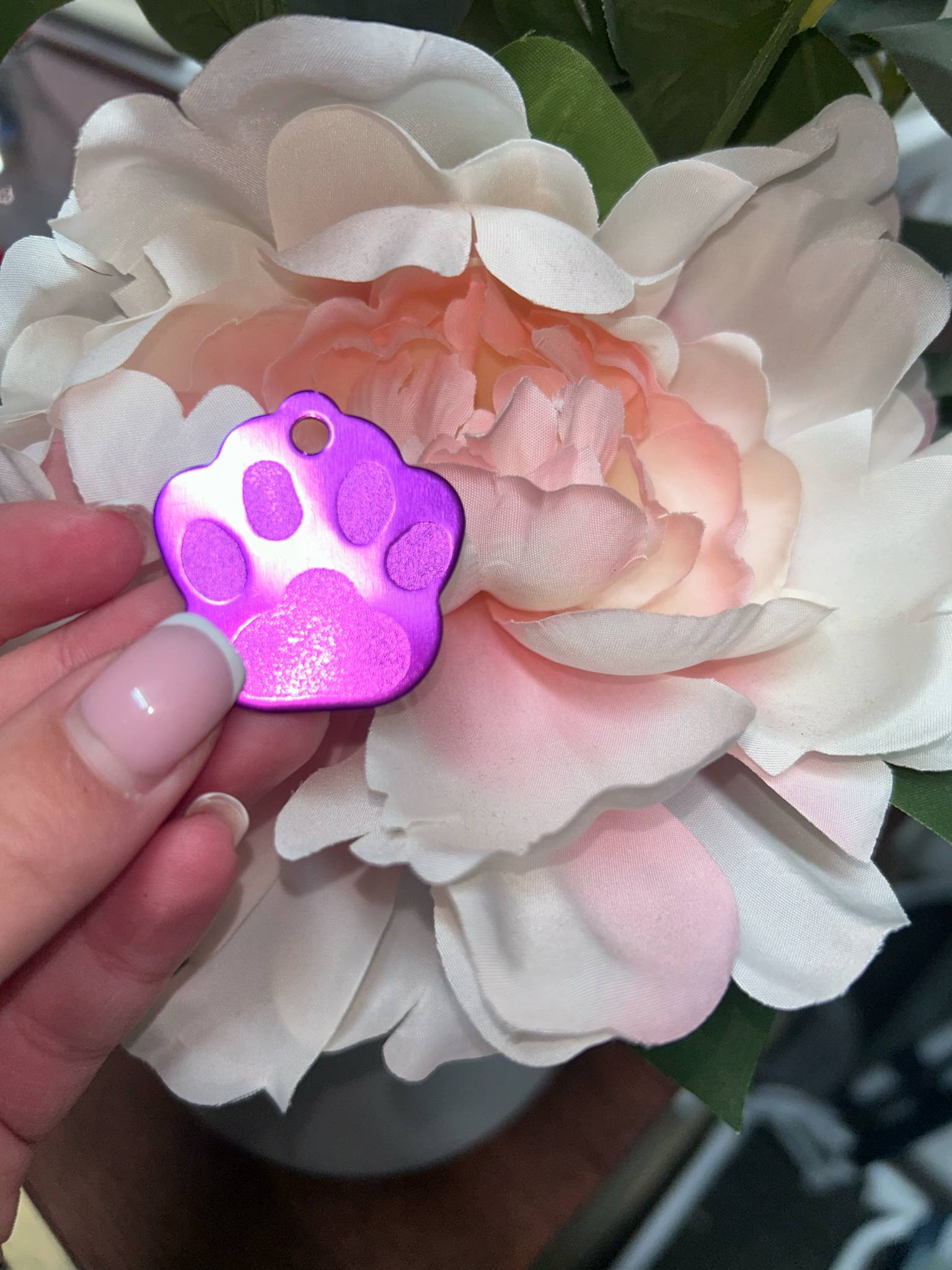 Add some pizzazz to your pet's identification with the Purple Paw id tag! A playful and eye-catching accessory that will make your furry friend stand out. No more boring tags, this one is as unique as your pet.