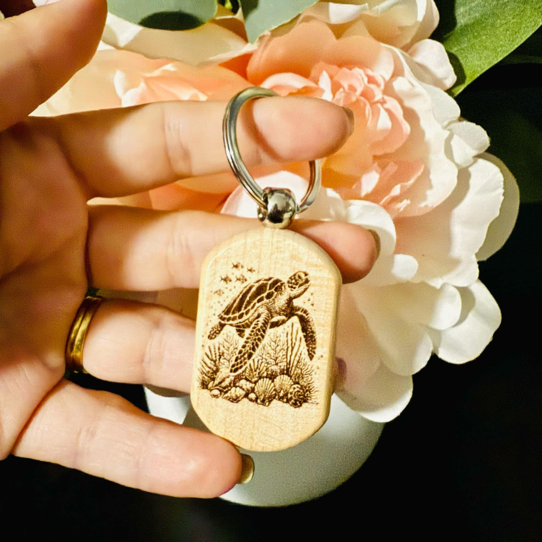 Stay organized and never lose your keys again with our Turtle Wooden Key Chain. This quirky and fun key chain can be personalized on the back, making it easy to identify if lost. Never let your keys wander off without you!